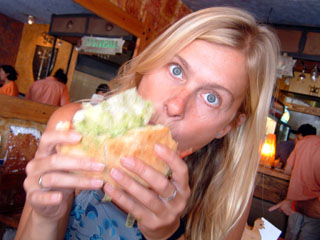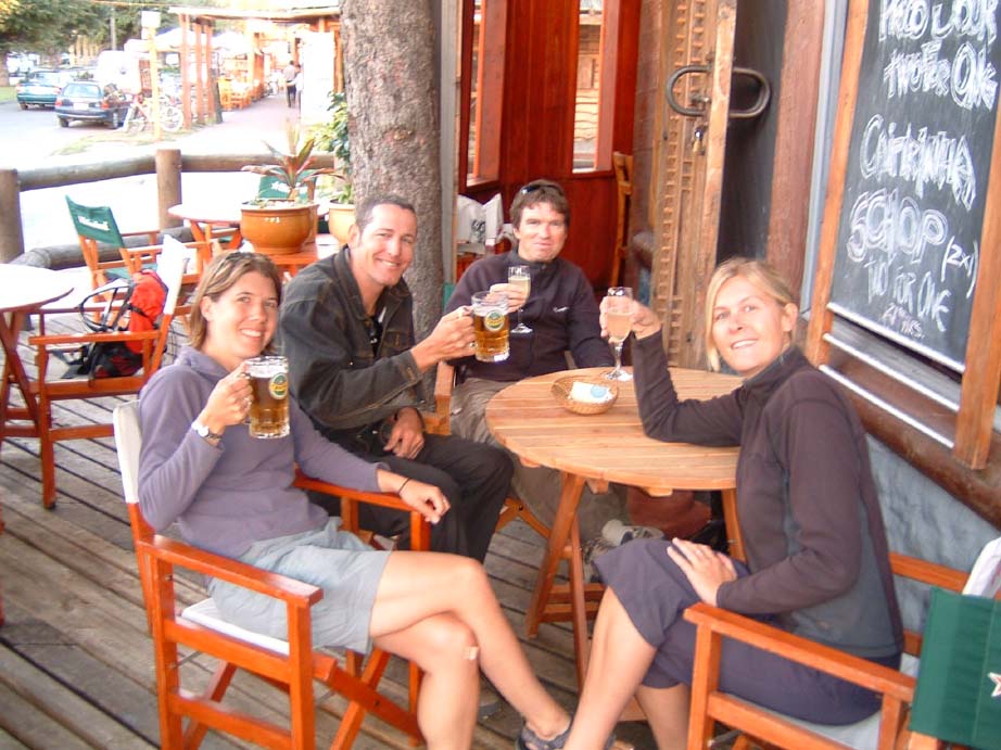 | Viv tucking into the best burgers in the world, Pucon | Enjoying a beer with Kaye and John |